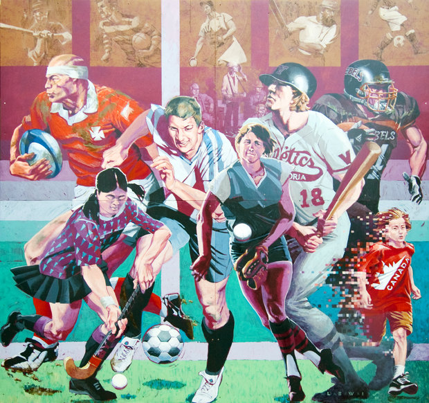 One of five outdoor artworks mounted on the fence of Royal Athletic Park as part of the parks's revitalization.
