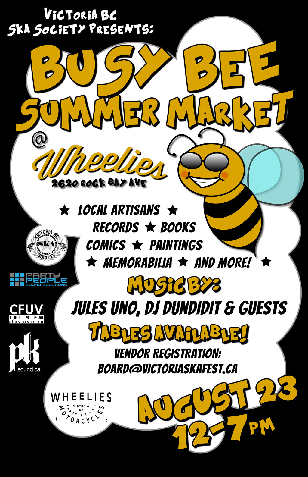 The Victoria BC Ska Society is pleased to announce our 1st Busy Bee Summer Market at Wheelies Motorcycles and Cafe. We welcome a wide array of participating vendors, swappers and shoppers! From local artisans, records, books, comics, paintings, memorabilia and much more.